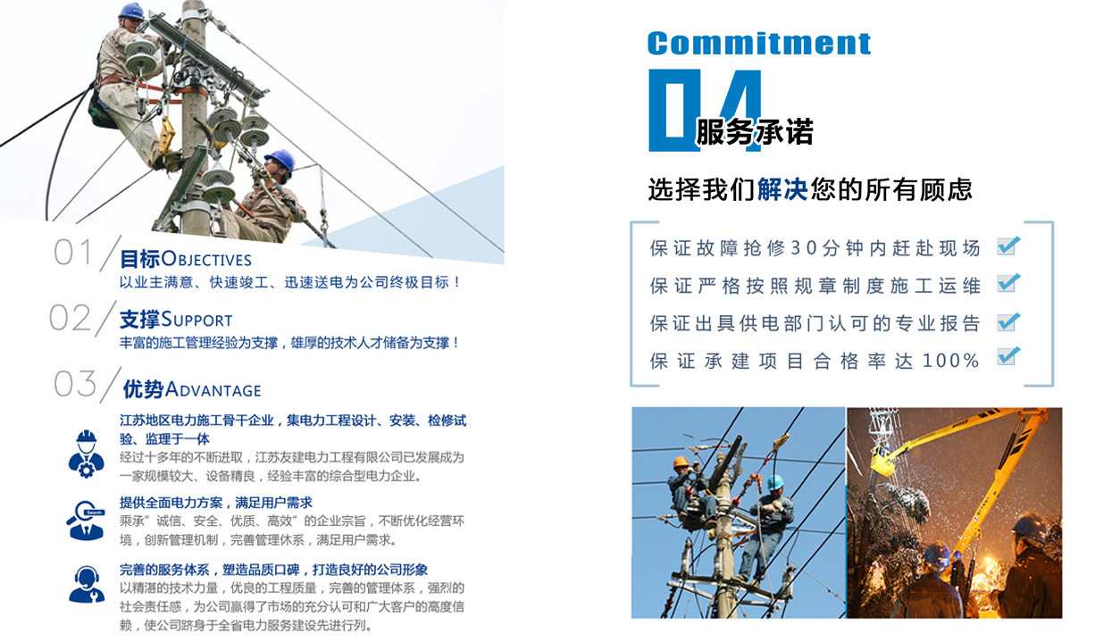 江蘇友建電力工程有限公司創建于2010年,坐落于歷史文化名城、周恩來總理故鄉——江蘇省淮安市,公司秉承“友善誠信、建功立業”的企業精神,先后邁過了“艱苦創業、快速成長、品牌創優”三個階段。